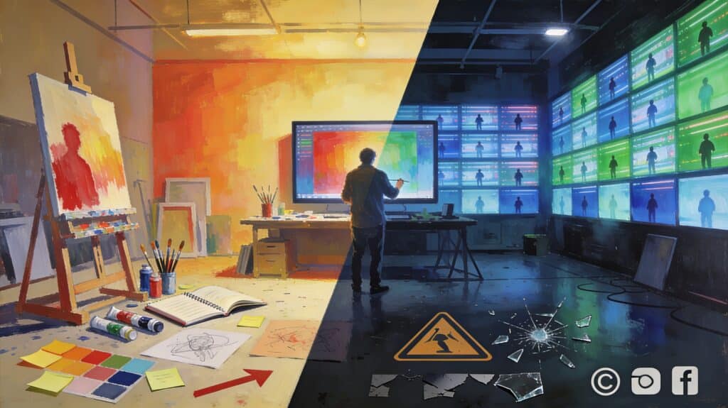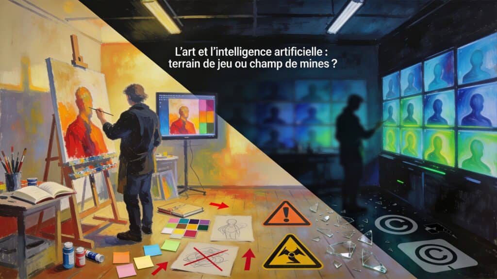 Mais, car il y a un ou des mais, ce terrain de jeu peut vite se transformer en champ de mines…confusion entre produire et créer, uniformisation des imaginaires, fragilisation des artistes et brouillage entre vrai, faux et sens. Poursuivez votre réflexion sur l’art et l’intelligence artificielle en prenant conscience de ses risques décrit dans l’article : L’Art et l’Intelligence artificielle : un champ de mines.
