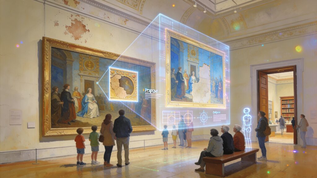 Pour le public, pour les regardeurs, l’intelligence artificielle peut devenir un formidable levier de curiosité. En effet, elle permet de créer des visualisations, des recompositions, des zooms, des simulations (par exemple, reconstituer un décor perdu, tester des hypothèses de couleurs d’origine) qui aident à mieux comprendre une œuvre sans la remplacer. L’IA peut aussi adapter le discours selon les publics : enfants, amateurs, spécialistes, visiteurs pressés ou curieux d’un détail précis. Elle devient un médiateur souple, capable d’accompagner différents niveaux de lecture. Ainsi, loin d’enfermer l’art dans la technologie, l’IA peut donc jouer le rôle d’embrayeur : elle donne envie de franchir la porte du musée ou de rouvrir le livre.